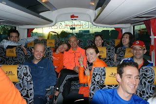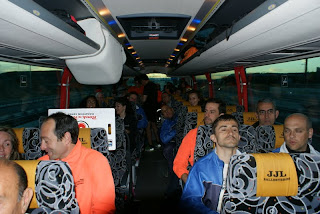 Asi iba el autobus camino de Madrid, unos a correr el maraton, otros a correr los 10 Kms, otros a animar y hacer fotos. Pero todos formando una piña y un equipo: